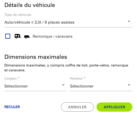Sélectionnez la liaison et la direction souhaitées, puis indiquez le type de véhicule ainsi que ses dimensions (largeur et hauteur). Vous pouvez ainsi facilement déterminer si votre véhicule peut être chargé.
